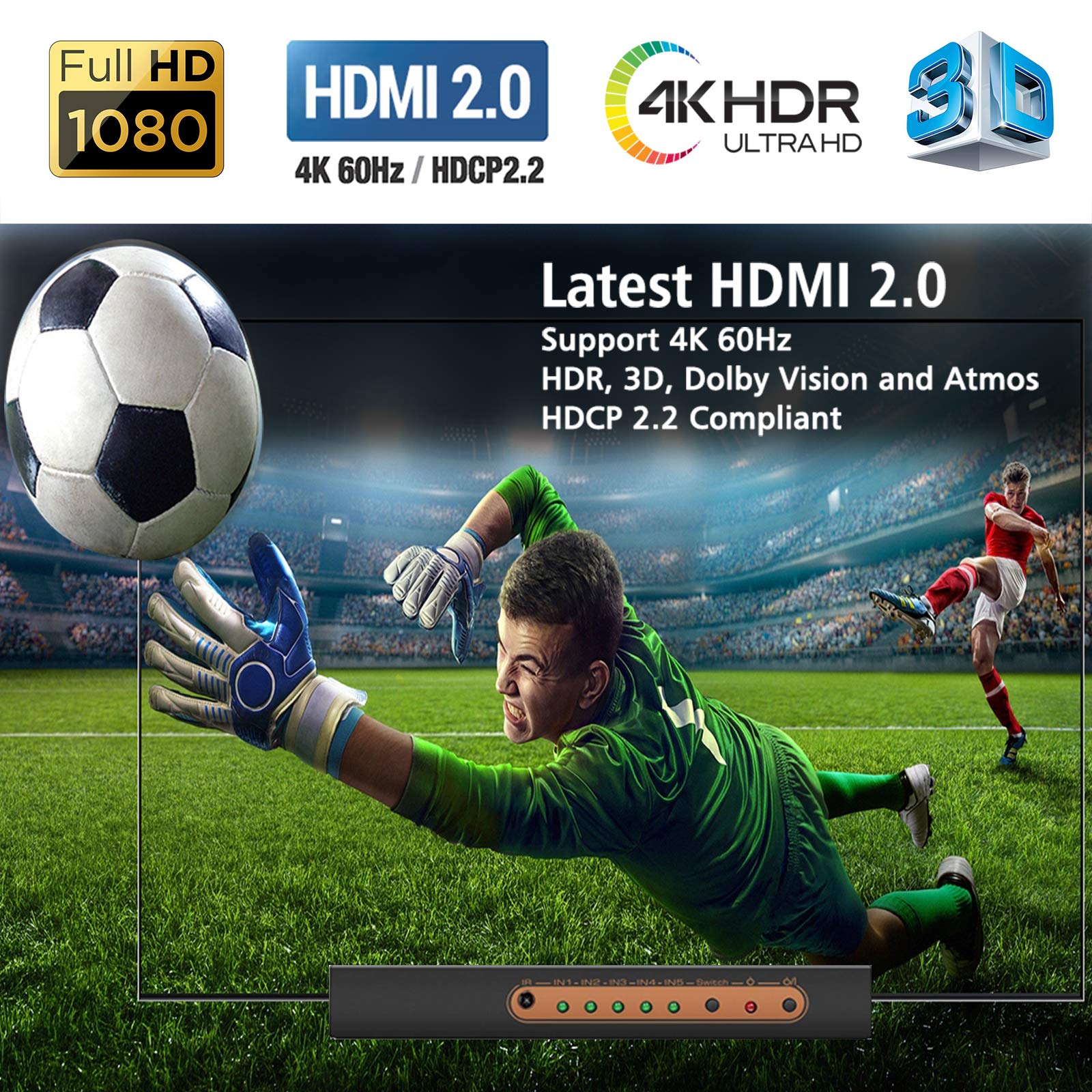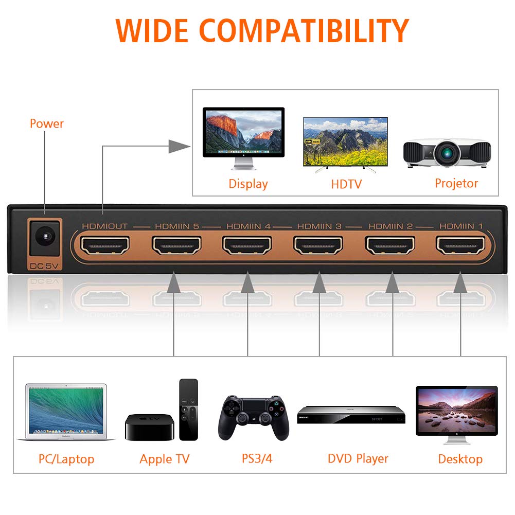 - 5 IN 1 OUT HDMI Switcher: Connect up to 5 HDMI 2.0 sources to 1 HDMI display (UHD TV, monitor, or projector). Compatible with computers, Blu-ray players, DVD players, AV receivers, Fire TV, Apple TV, Roku, TV Box, PS3/4, Xbox One/360, Nintendo Wii, and more. Easily switch sources without unplugging HDMI cables.