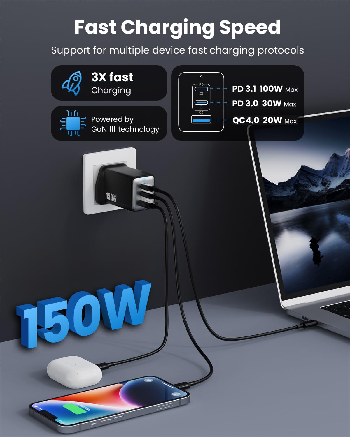 - Super Fast Charger Plug: Compatible with PD 3.0/2.0, QC 4.0+/3.0/2.0, PPS, AFC, SCP, and other fast charge protocols. Delivers a total power of up to 150W. Charges a MacBook Pro 16" to 60% in just 0.5 hours with the USB-C1 port providing up to 100W. The other 2 ports share 50W, keeping all devices powered efficiently.